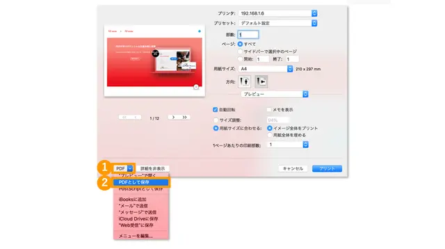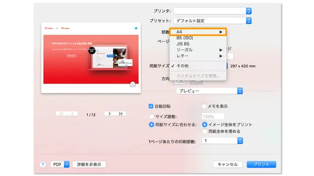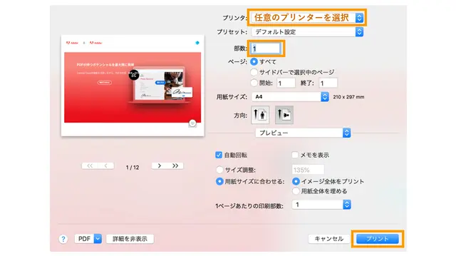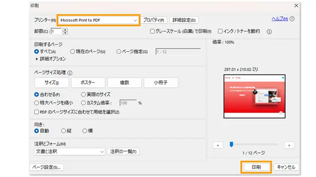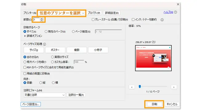 表示されたメニューの中から「プリント」をクリックすると、PDFファイルの印刷設定画面が立ち上がります。