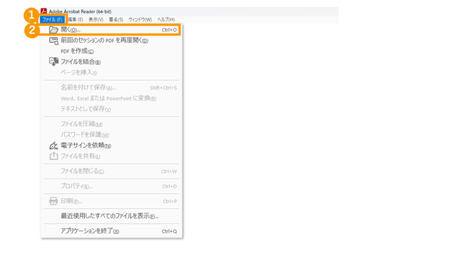 Adobe Acrobat Readerを立ち上げて画面上部の「ファイル」を選択すると、メニューが表示されます。