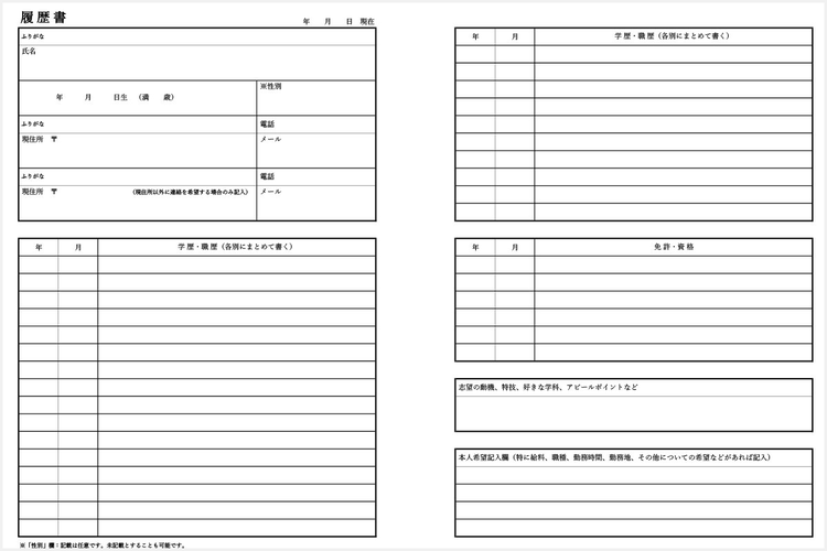 学歴・職歴欄のスペースが大きく設けられている履歴書テンプレートです。