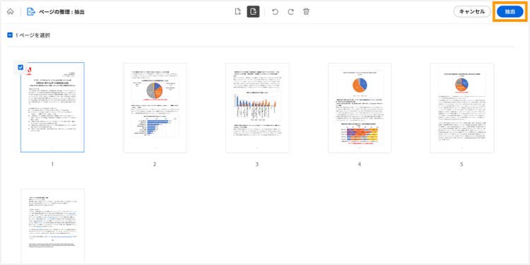 画面右上の「抽出」ボタンをクリックすると、選択したページだけを残したPDFファイルを作成できます。