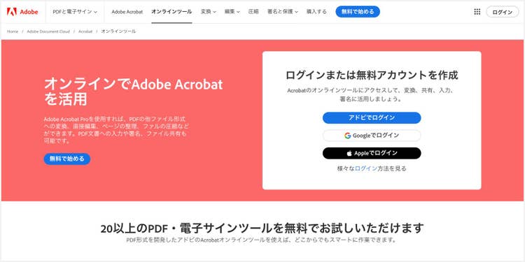 アップロードが完了したら、画面左のボタンからAcrobat オンラインツールに無料でログインします。ログイン方法は、Adobe アカウントに加えて、Google アカウント、Facebook アカウント、Apple IDから選べます。