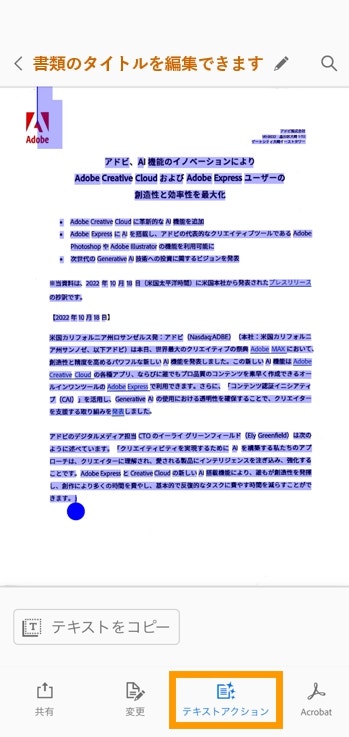 Adobe Scanで紙をスキャンした後に「テキストを編集」をタップすると、以下のように Acrobat Readerのアプリが開きます。