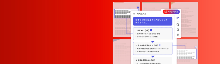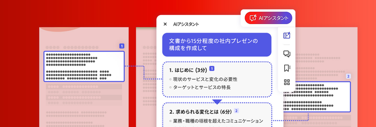 企画書をAcrobatで開き、AIアシスタントに「文書から15分程度のプレゼンの構成を作成して」と指示すれば、どのようにプレゼンテーションすればよいかのストーリーラインを提案してくれます。 また、「アイスブレイクのアイデアが欲しい」と指示すれば、プレゼンテーションを盛り上げるアイスブレイク用のトークを提案してもらえます。