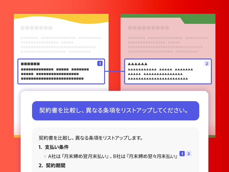 AIアシスタントを用いて複数のバージョンの資料を一括で読み込めば、内容を比較できます。 たとえば、新旧の契約書を比較し、どの部分が更新されたのかをすばやく確認できます。 該当箇所へのリンクも表示されるので、該当箇所を的確に見つけられます。