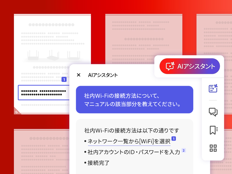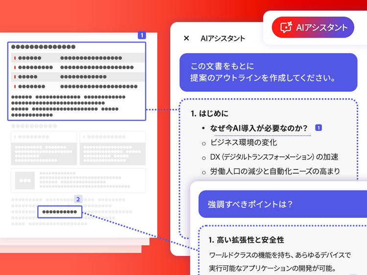 AIアシスタントを使えば、文書内の知りたい情報のみを抽出できます。 たとえば、顧客から製品に関する質問を受けた際、製品仕様書やマニュアルから回答となる情報を抽出することで、スピーディーに回答できます。 また、複数の資料を横断して情報を抽出することも可能です。
