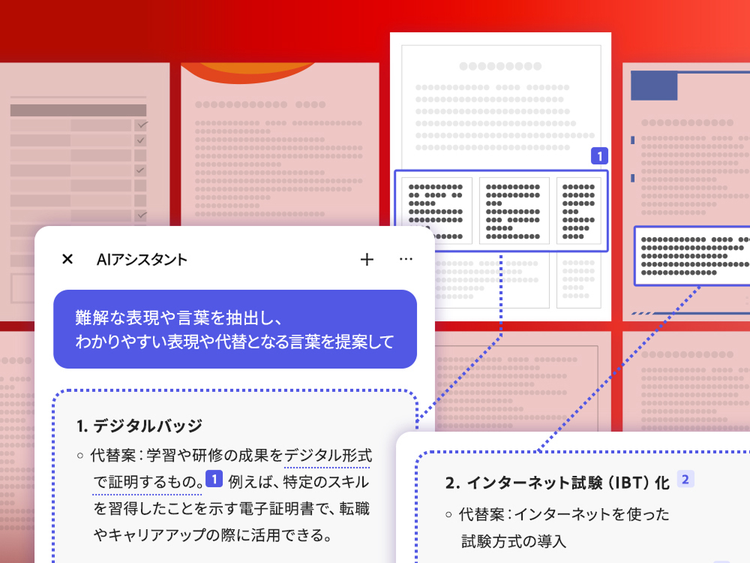 資料をAIアシスタントで読み込み、「難解な表現や言葉を抽出し、わかりやすい表現や代替となる言葉を提案して」と指示すれば、専門用語をピックアップし、それらの用語の説明や、より平易な表現を提案してもらえます。