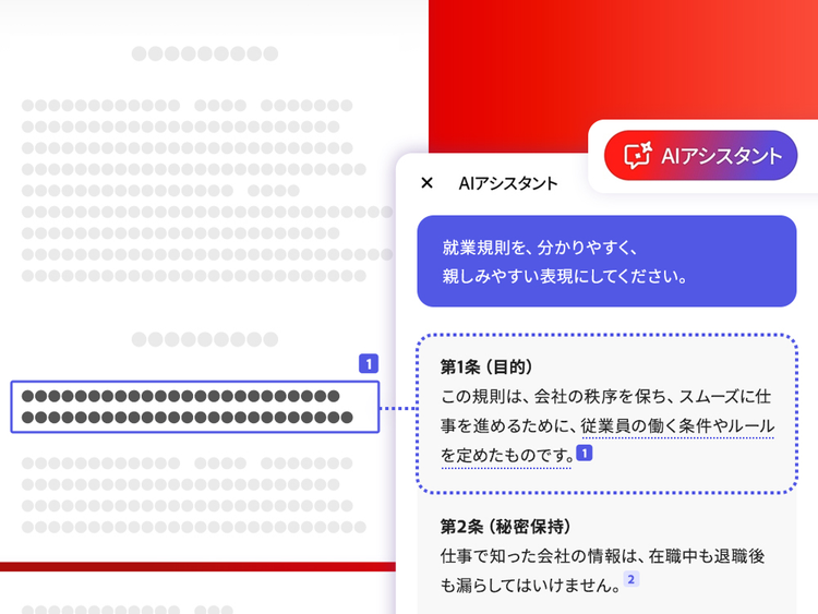 資料をAcrobatで開き、AIアシスタントに「もっとフレンドリーなトーンにして」と指示すれば、資料の文体をすばやく変更できます。 たとえば、自社の内定者向けの案内資料をフレンドリーな文体にした資料を作成すれば、社員のスムーズなオンボーディングに活かせます。