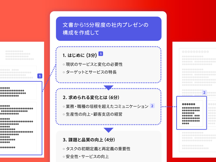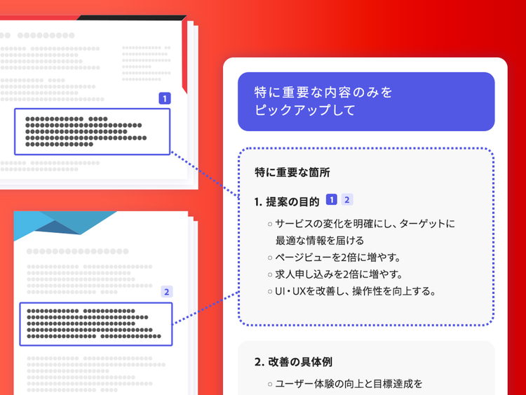 複数の提案資料などをAIアシスタントで読み込み、「特に重要な内容のみをピックアップして」と指示すれば、複数の資料から重要な箇所のみを抽出してくれます。 その情報を活用すれば、要点がまとまったダイジェスト版の資料を効率よく作成できます。