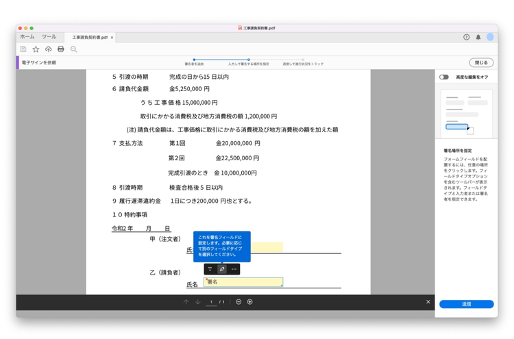 署名をしてもらいたい契約書や請求書を開いて、送る相手のメールアドレスを入力します。複数の相手に送ったり、署名する順番を指定することもできます。