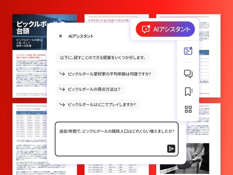 AcrobatにAIアシスタントが新登場。文書に関する質問や、ワンクリックでの要約が表示でき、文書業務の効率が高まります。価格はPRICE - ABM - AI Assistant for Acrobat(税込)からです。