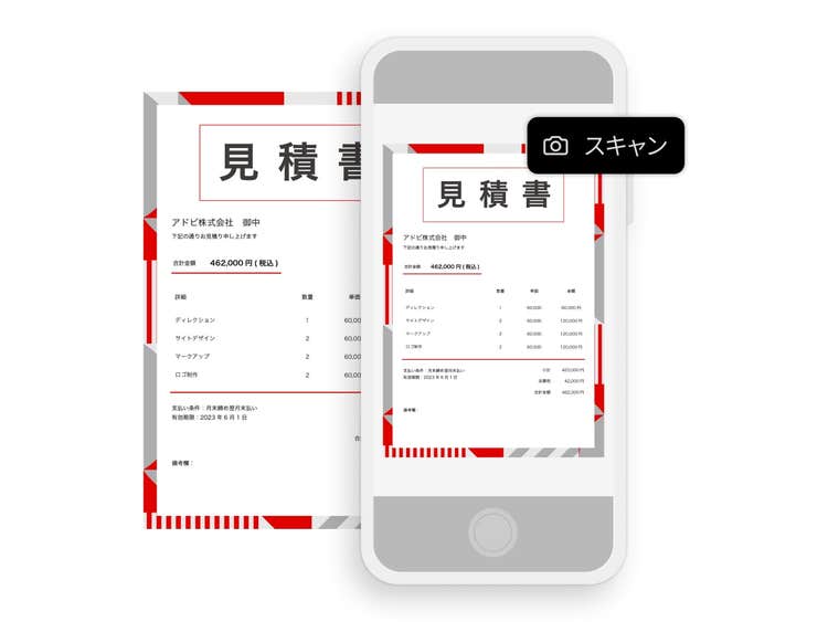 紙の見積書を、モバイルアプリのAdobe Scanを使用して、スマートフォンやタブレットで撮影し、その画像を自動でPDFに変換できます。紙の傾きやゆがみが自動で補正され、不要な背景も削除できます。また、OCR処理により文字が認識されるため、キーワードから簡単に検索することも可能です。