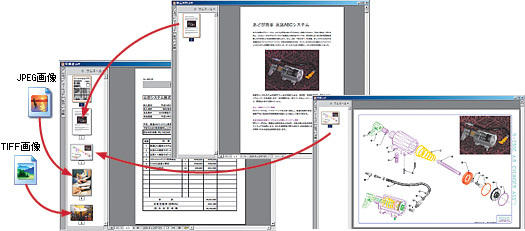 | 1ページ目はExcelから作成した見積書のPDF、2ページ目はWordから作成した製品資料、3ページ目はAutoCADから作成した図面です。Acrobat 5.0を使えば、あたかも紙を束ねるかのように別々の文書をひとつのファイルにまとめることができます。 |