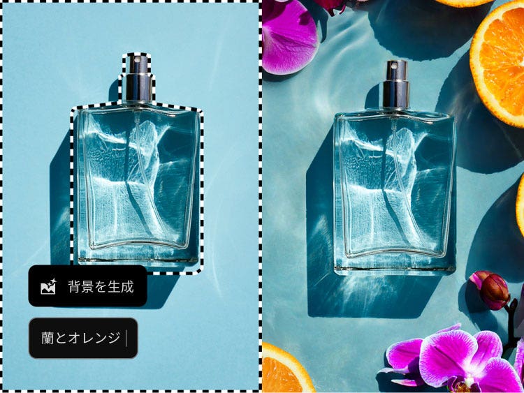 生成背景を使用して、被写体を地元の街角から世界中のどこにでも移動させることができます。説明を入力するだけで、被写体の明るさ、影、遠近感とマッチする新しいシーンに一瞬で置き換えることができます。
