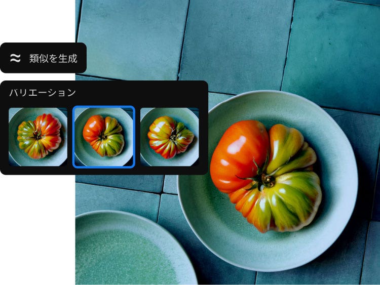 アイデアをすばやく試すことができます。生成塗りつぶしを使用すると、質の高いコンセプトを簡単にいくつも作ることができます。「類似を生成」では、お気に入りの生成画像に似た画像のバリエーションを生成できます。