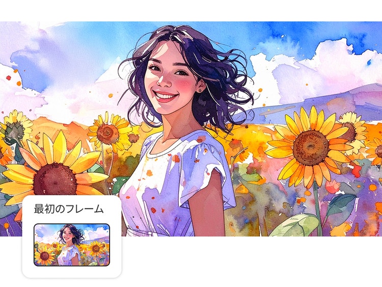 静止画のビジュアルから、フルHDの鮮明かつ高品質な映像を作成できます。滑らかでダイナミックな動画を数秒で生成します。
