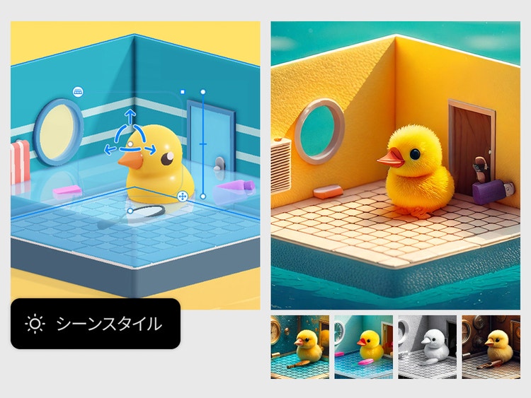 統合された一つのワークスペースで、3D作成と画像生成を簡単に切り替えることができます。複数のバリエーションを試し、適切なクリエイティブを探りましょう。