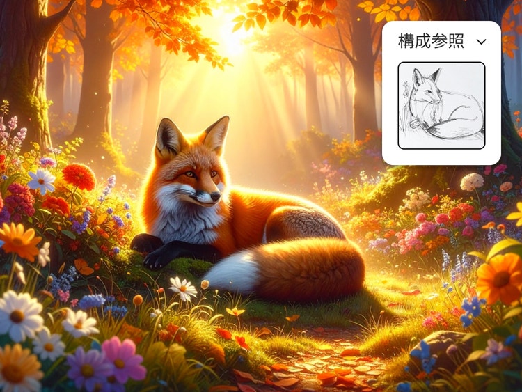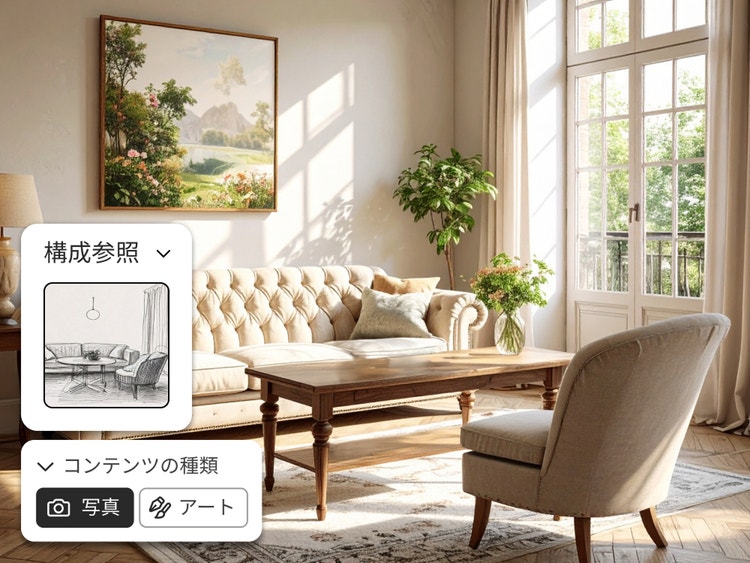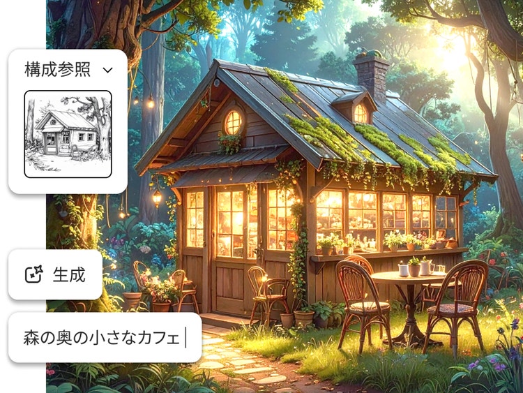 「スケッチから画像生成」のAI機能を使って、シンプルなスケッチを魅力的なデジタルアートへと簡単に変換できます。洗練された高品質の画像で、あなたのデザインをレベルアップさせましょう。