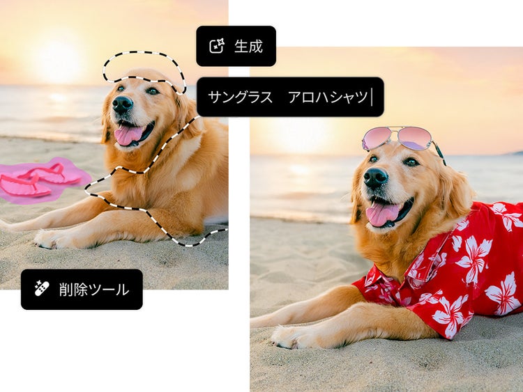 {{photoshop}}の生成AI機能なら、背景削除や不要物の除去、生成塗りつぶしなどを直感的に行えます。プロフェッショナルレベルの仕上がりを効率よくスピーディーに実現することが可能です。
