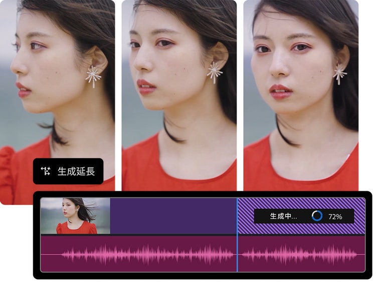 {{premiere}}の生成AI機能「生成延長」により、クリップの延長や背景音の自動生成が可能です。また、自動翻訳や映像検索機能で、編集作業のスピードと精度が向上します。