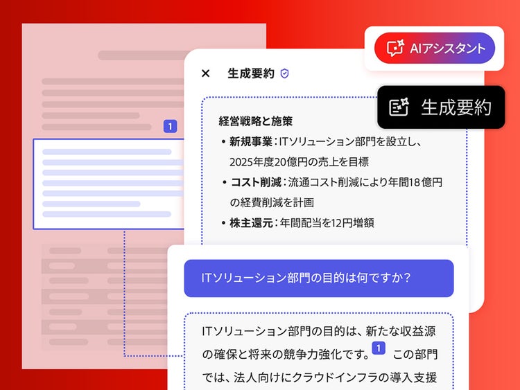 {{acrobat}}のAIアシスタントは、任意の質問にチャット形式で回答したり、内容を要約したりできます。 PDFの作業効率を劇的に向上させることが可能です。