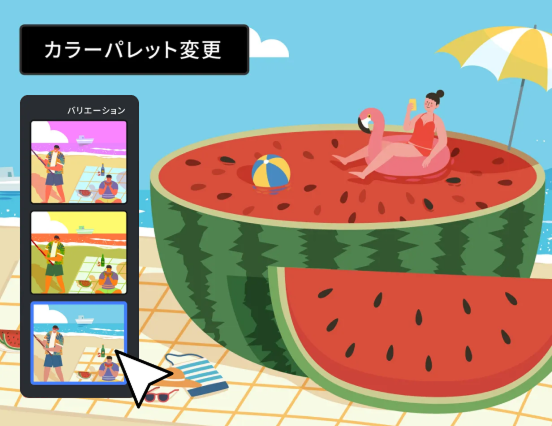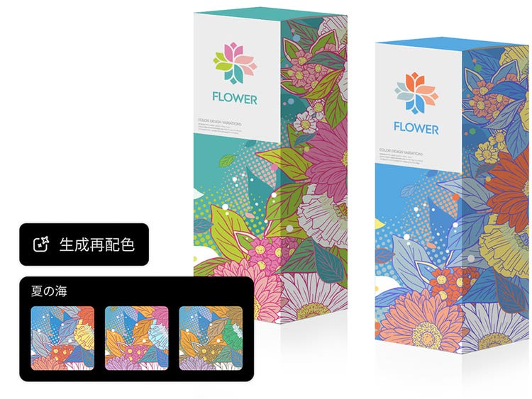 生成再配色は、生成AIがデザインのカラーを自動分析し、目的に応じた配色を提案します。ブランドやテーマに合わせて、一貫性のある魅力的な配色を簡単に検証できます。