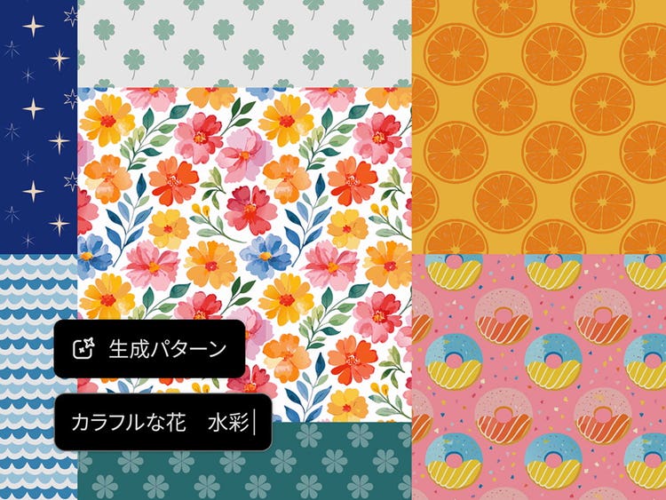 {{illustrator}}のパターン生成AIを使えば、手間のかかるパターン制作が簡単に。スタイルやテーマを指定するだけで、多彩なバリエーションのパターンを素早く生成でき、デザイン作業を効率化します。