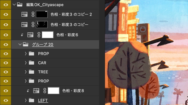 後から色・レイアウトを変えたり、編集できるようにレイヤーを細かく分けて制作。過去には1つの絵で2500を超えたことも…。