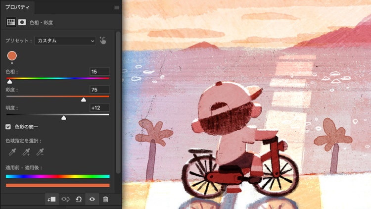 調整レイヤーを駆使し、空と海が溶け合うグラデーションにオレンジやピンクを基調とした色彩設計を発見。暖かくて少し切ない「一日の終わり」の空気感を演出。