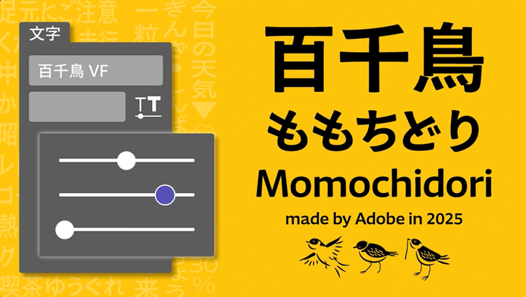 新たにAdobe Fontsに加わったアドビのオリジナル日本語フォント「百千鳥(ももちどり)」は、太さに加えて、縦長・横長への変更にも対応したバリアブルフォントです。Illustratorではその機能をフルに活用でき、使いたいイメージに合わせて調整が可能です。
