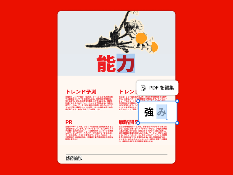 Adobe Photoshop、Illustrator、Acrobat Proを含む20以上の最先端のアプリ、統合された生成AI、共同作業ツール、ビジネス向けの特別な機能を活用することで、目を引くコンテンツを作成し、中小企業の成長を後押しできます。