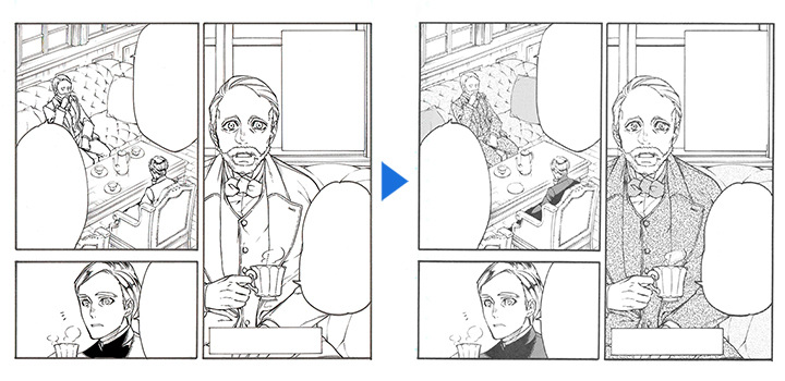 図は19世紀のヨーロッパを舞台にした漫画の一部で、左はトーンで効果を入れる前のもの、右はトーンで効果を入れたものです。トーンの効果が入ることによって、画面にメリハリがつき、リアリティも増しています。