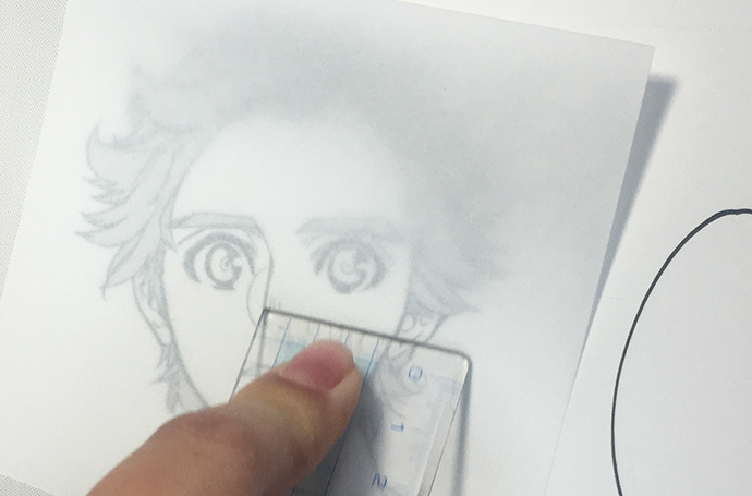 問題がなければ、仮着状態のトーンをしっかりとつけるために、トーンの上に台紙をあてて、ヘラなど平なもので丁寧にこすります。トーンがしっかりと定着したら完成です。削りを入れる場合は、定着させてから削ると細かい作業がしやすくなります。