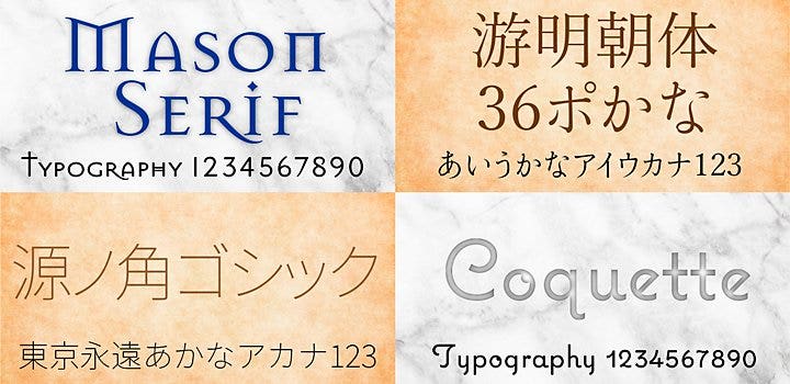 例えば日本語フォントでは、伸びやかな明朝体や細いゴシック体がおすすめです。欧文フォントではコントラストの強いセリフ体やスクリプト体を使うと上品な印象になります。また図のような装飾的な処理をした書体を使ってもよいでしょう。