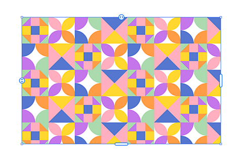 幾何学模様のモチーフを選択し、「オブジェクト」メニューの「リピート」から「グリッド」を実行するとデフォルトの設定でグリッドが作成されます。バウンディングボックス上のウィジェットをドラッグして間隔や大きさを自由に調整してみましょう。これらの設定にアクセスするには、「オブジェクト」メニューの「リピート」から「オプション」を選ぶ、またはコントロールパネルやプロパティパネルを使用します。