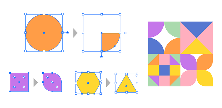 これらはすべてライブシェイプとして描画されるため、円から角度を指定して扇形を作る、多角形の角の数を変える、長方形の角の形をアレンジするといった作業は、「変形」パネルやウィジェットの操作だけで完了します。図形の角度を変えたり、回転コピーをしたり、基本図形にアレンジを加えて、幾何学模様の元となるモチーフを完成させましょう。