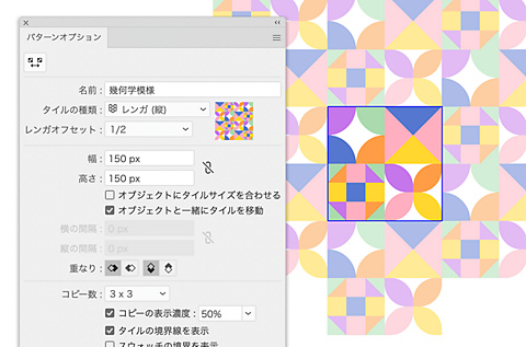 パターン編集モード中に表示されるパターンオプションパネルでは、タイルの種類や大きさを変更できます。モチーフに合わせた設定を行なえば、幾何学模様風のパターンの完成です。スウォッチパネルでパターンのサムネイルをクリックして、オブジェクトの線や塗りに自由に適用しましょう。