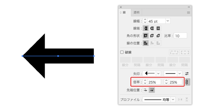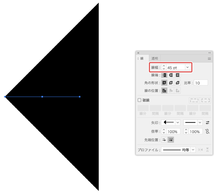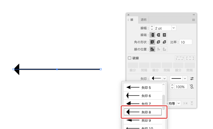 ※「線幅」の数値を大きくすると、線の太さに合わせて矢印の先端も大きくなります。