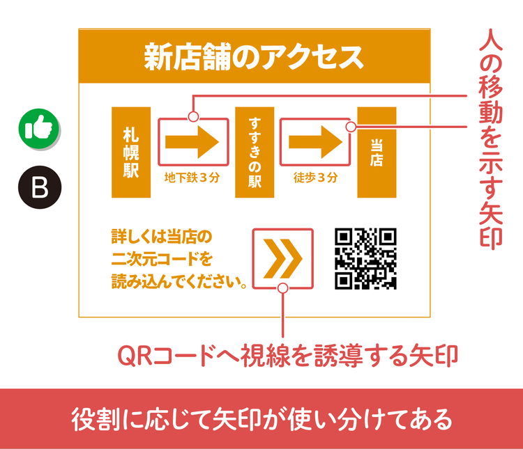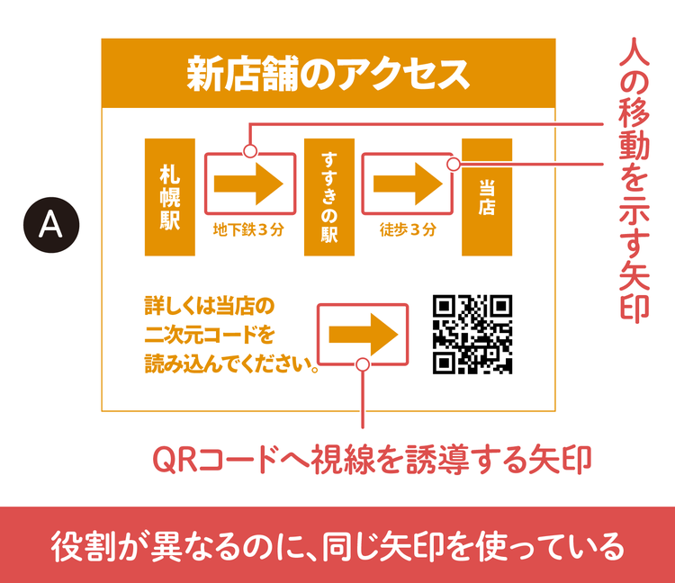 「人の移動を案内する矢印」と「二次元コード(QRコード)へのアクセスを案内する矢印」です。