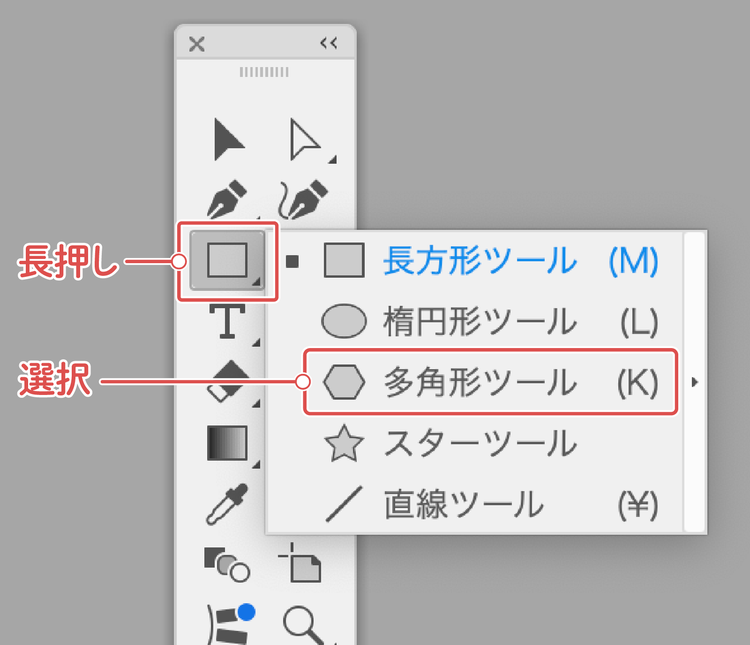 1.ツールバーから「長方形ツール」を長押しして「多角形ツール」を選択します。
