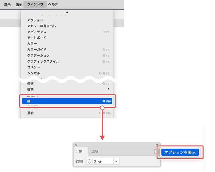2.引いた線を選択した状態で、「ウィンドウ」>「線」で線パネルを開き「オプションを表示」をクリック