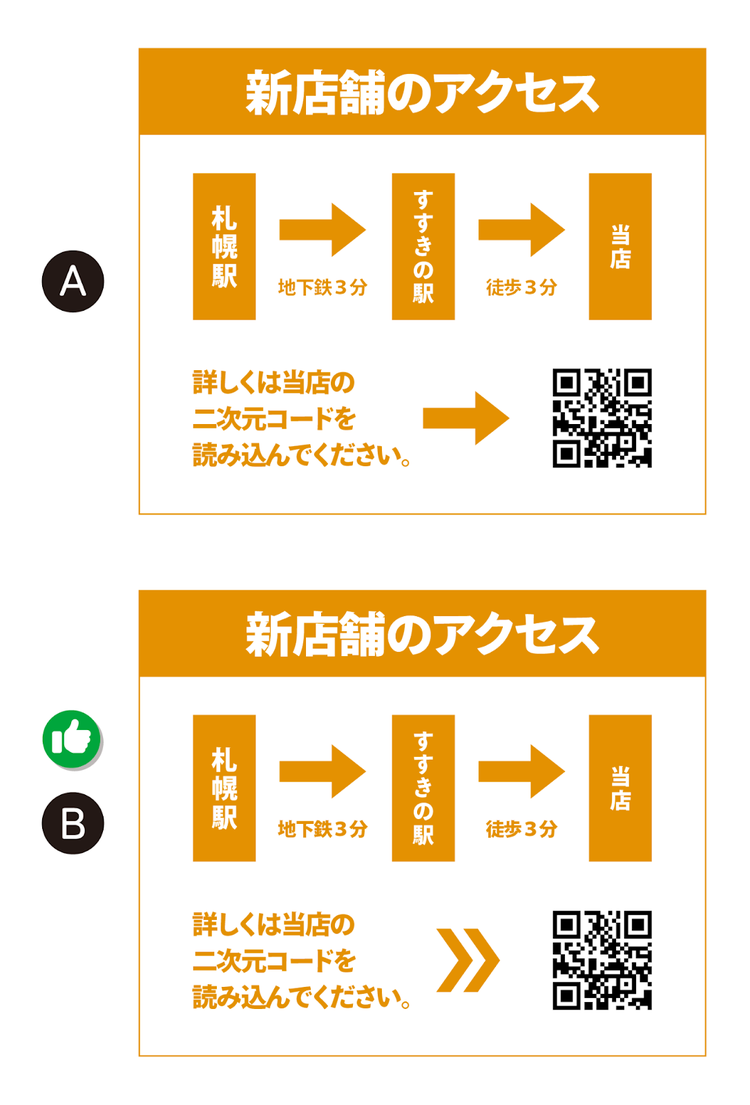 作例AとBの違いは、画像下部の二次元コード(QRコード)に案内している矢印の「形状」です。