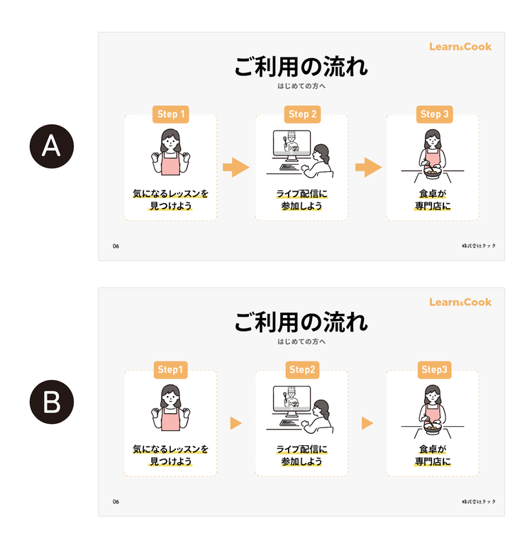 作例AとBの違いは、STEPの情報をつなぐ矢印の「形」と「大きさ」です。