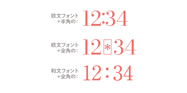 - 和文フォントの全角コロンを使うと、前後の文字間が広く空いてしまい、数字とのバランスが崩れやすい