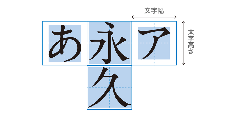 和文フォントは「仮想ボディ」と呼ばれる正方形を基準に設計されており、文字の幅と高さが等しく揃えられています。