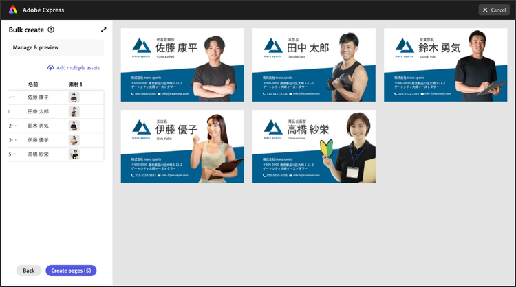 Adobe Expressには「一括作成」機能があり、この機能を用いれば、Illustratorでつくられた名刺デザインのデータをもとに、複数人の名刺をカンタンにつくれます。