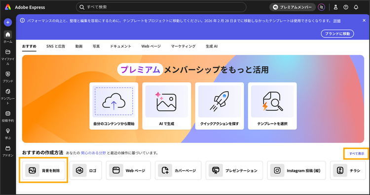- Adobe Expressにアクセスし、「おすすめの作成方法」から【背景を削除】をクリック