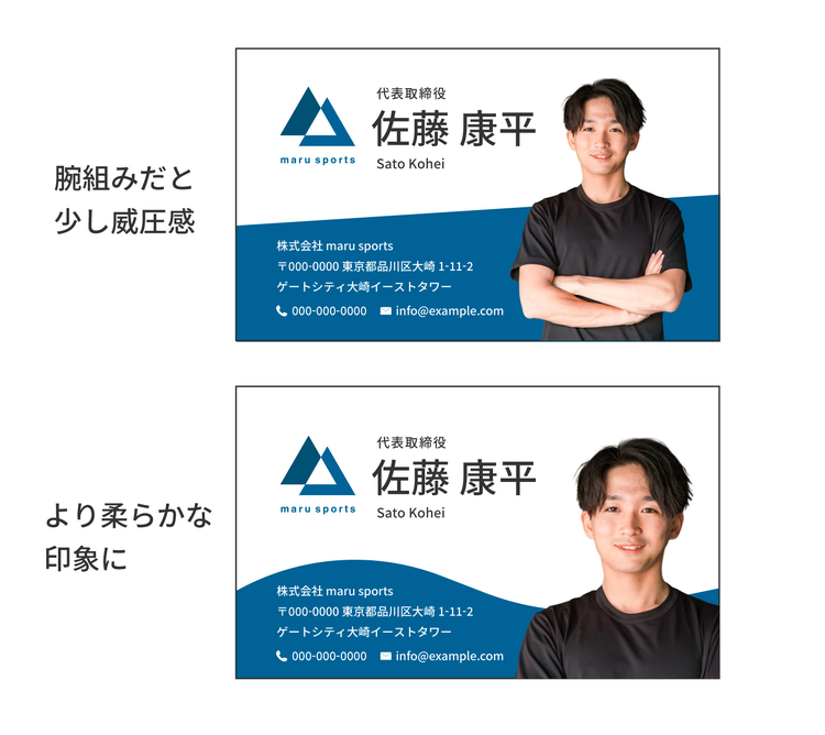 多くの名刺でもこのポーズを活用している一方で、腕組みには「威圧感がある」「距離を置きたくなる」と感じる方もいるため、受け手によっては印象が強くなりすぎてしまうこともあります。