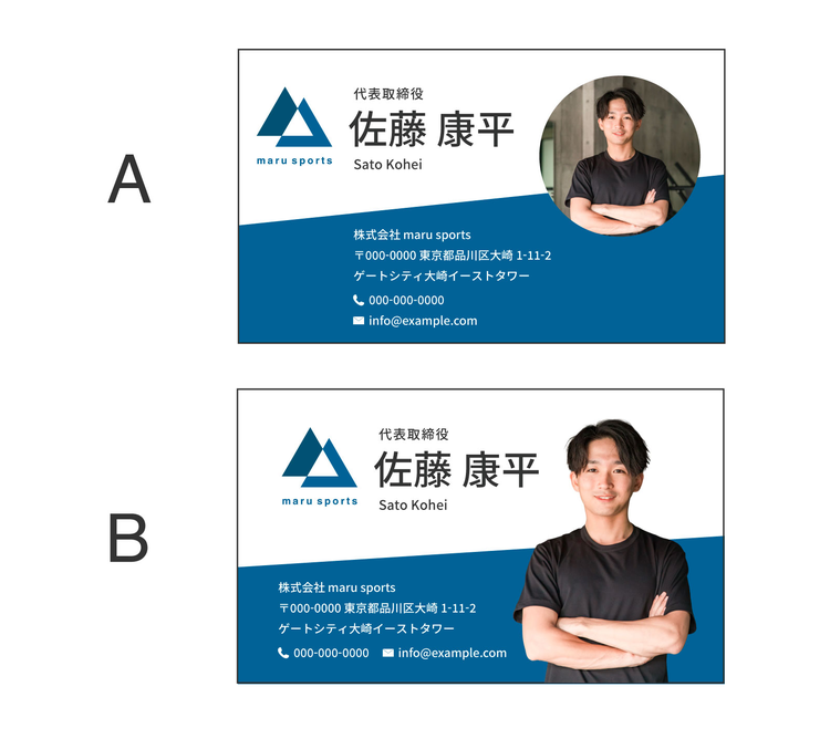 こちらは架空で制作した、スポーツジムmaru sports代表取締役の佐藤康平さんの名刺です。