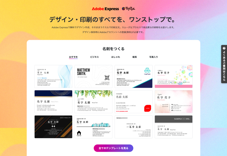 Adobe Expressには名刺用のデザインをはじめ、チラシやポスターといったさまざまなデザインテンプレートが用意されています。