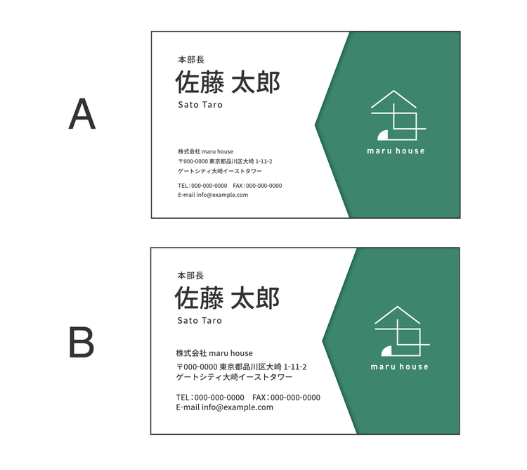 こちらは架空で制作した、住宅メーカーmaru house代表取締役の佐藤太郎さんの名刺です。